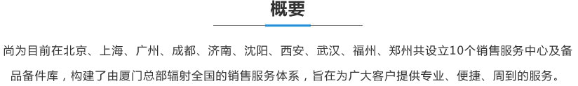 尚為目前在北京、上海、廣州、成都、濟(jì)南、沈陽、西安、武漢、福州、鄭州共設(shè)立10個(gè)銷售服務(wù)中心及備品備件庫,構(gòu)建了由廈門總部輻射全國(guó)的銷售服務(wù)體系,旨在為廣大客戶提供專業(yè)、便捷、周到的服務(wù)。